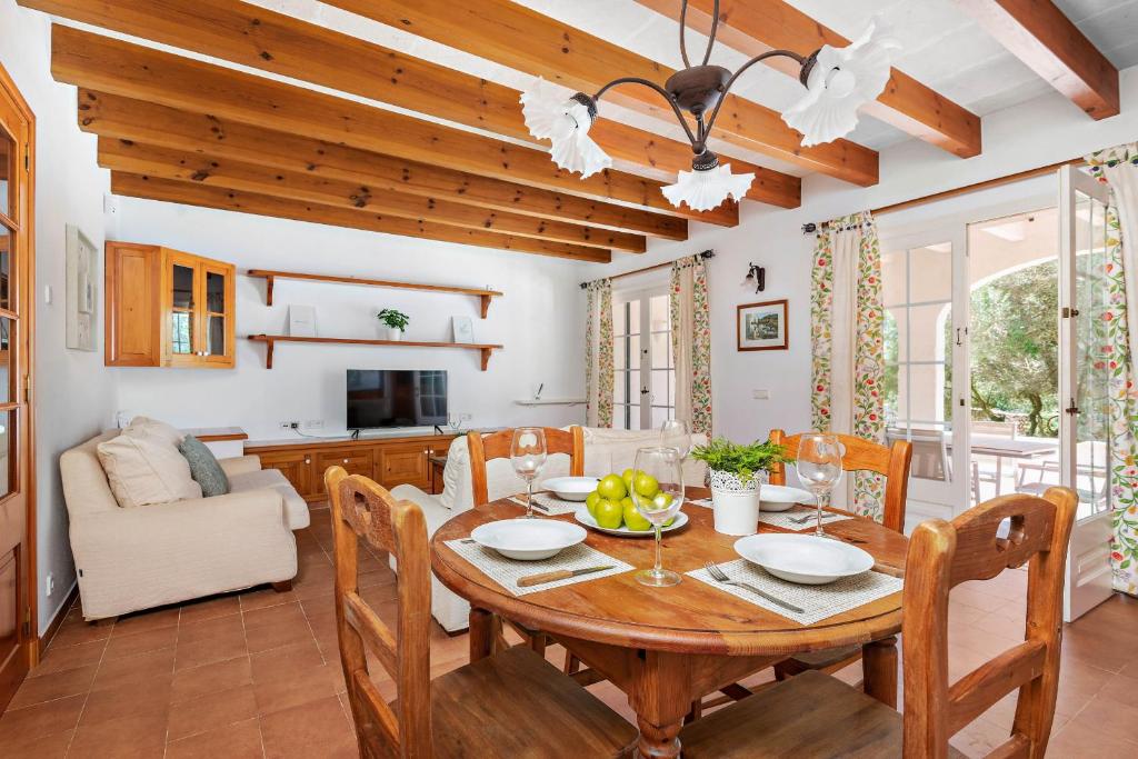 Inside, this villa in Menorca with a pool exudes understated elegance, featuring wooden beams, handcrafted furniture and traditional shutters that add warmth and authenticity. Its large windows offer spectacular views of the Menorcan countryside.