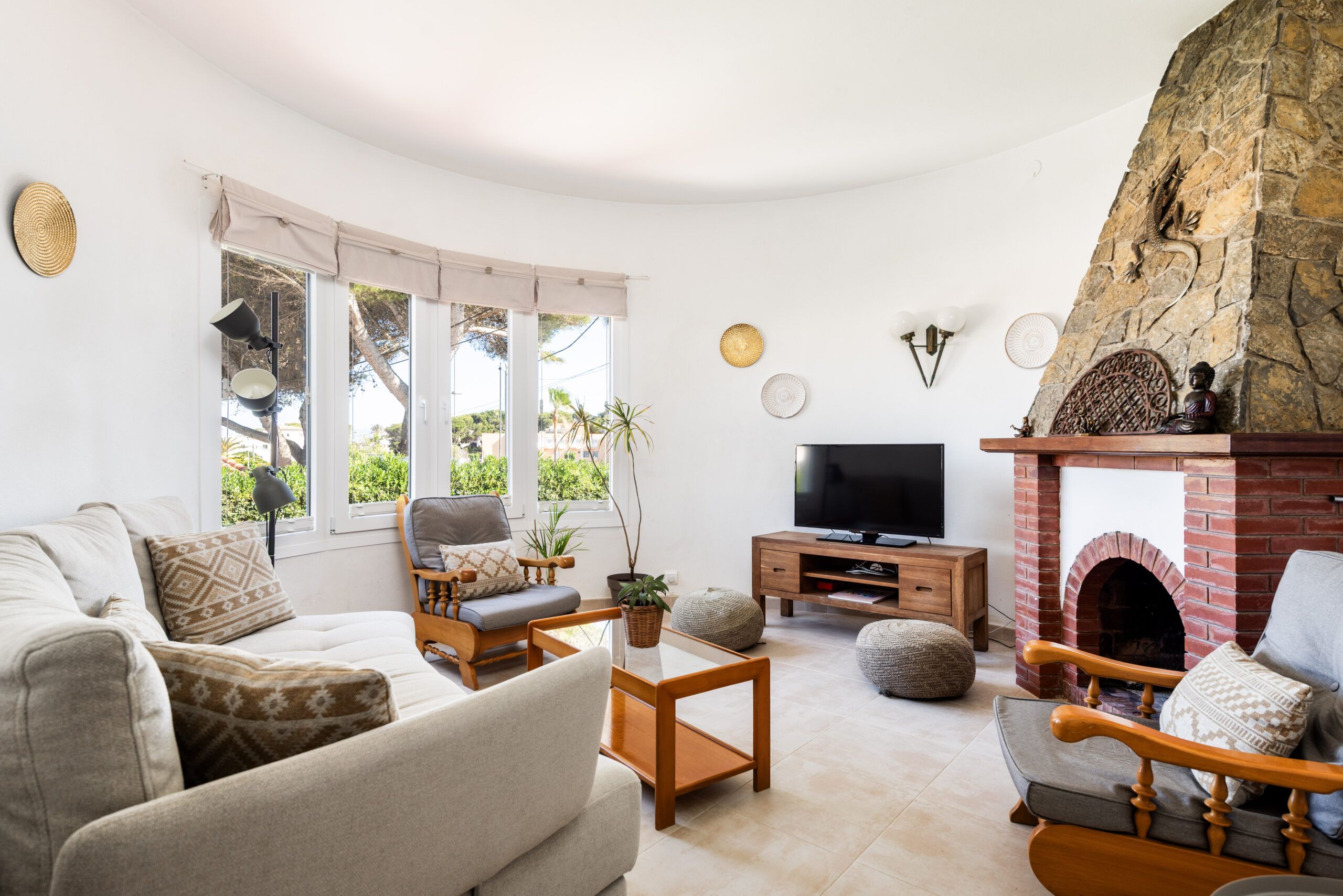 The house features three bright bedrooms, two full bathrooms, and spacious interiors decorated in a warm Mediterranean style. The main living room, with its fireplace and large windows, opens onto a cozy dining area and a fully equipped kitchen with direct access to the outside.